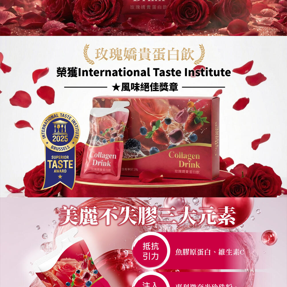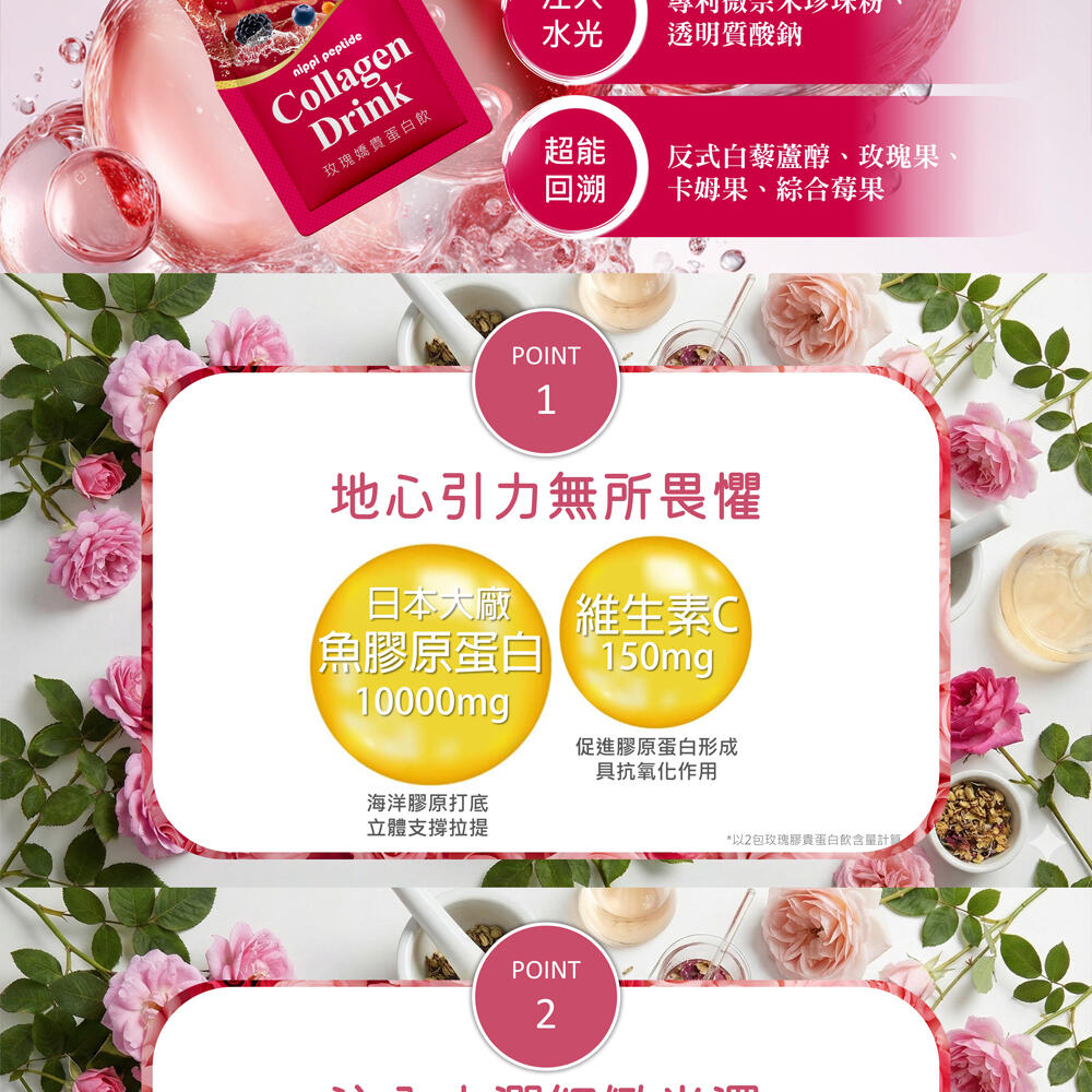成分:水、魚膠原蛋白、蘋果濃縮汁、蜜桃濃縮汁、異麥芽寡糖、檸檬酸、維生素C、卡姆果萃取物(卡姆果萃取物、麥芽